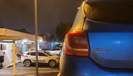 Uma rápida ação entre as guarnições policiais de Jaguaruna, Criciúma e Içara resultou na localização do veículo Renault Sandero de cor azul.