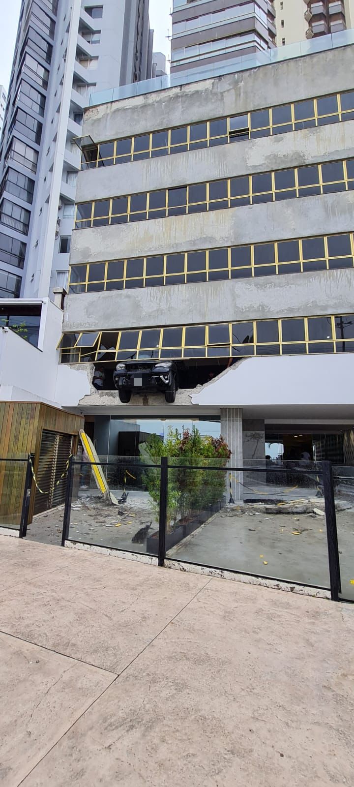 Um carro quebrou a parede de uma garagem em um edifício de Balneário Camboriú, no Litoral Norte catarinense, na manhã deste sábado (9).