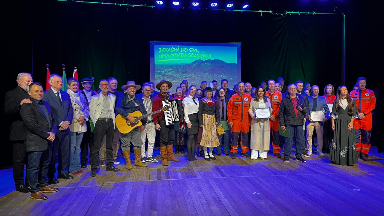 O calendário de eventos dos 148 anos de Jaraguá do Sul teve início na noite desta segunda-feira (1º), com a solenidade “Jaraguá do Sul uma cidade solidária”, na Scar. Foram homenageadas pessoas que contribuíram de forma voluntária para o fortalecimento e preservação da cultura, com integrantes representando as cinco etnias formadoras do Município (alemã, polonesa, húngara, africana e italiana) e os voluntários que auxiliaram o Rio Grande do Sul na tragédia vivida devido às chuvas em maio deste ano. A noite marcou o reconhecimento ao trabalho voluntário e solidário que está presente na história de Jaraguá do Sul.