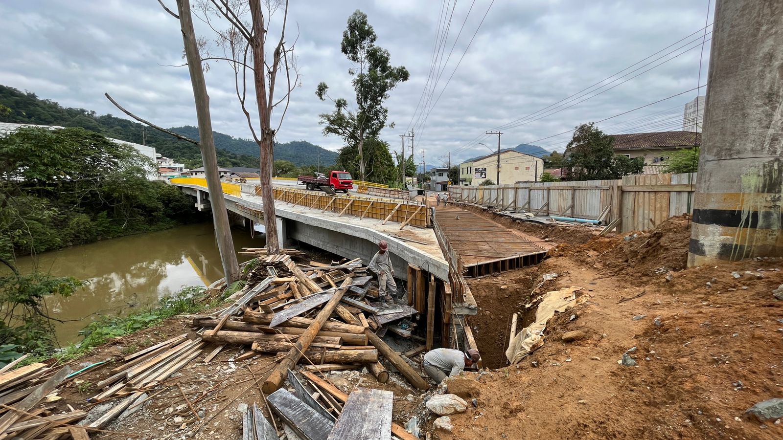 A ponte que liga os bairros São Luís e Barra do Rio Cerro, conhecida como “Ponte do Brasão”, deve ser concluída ainda nesta semana. Está sendo realizada a concretagem da laje de aproximação na cabeceira da ponte. A intervenção marca uma etapa decisiva para o andamento da obra, que tem previsão de conclusão até o final deste mês.
