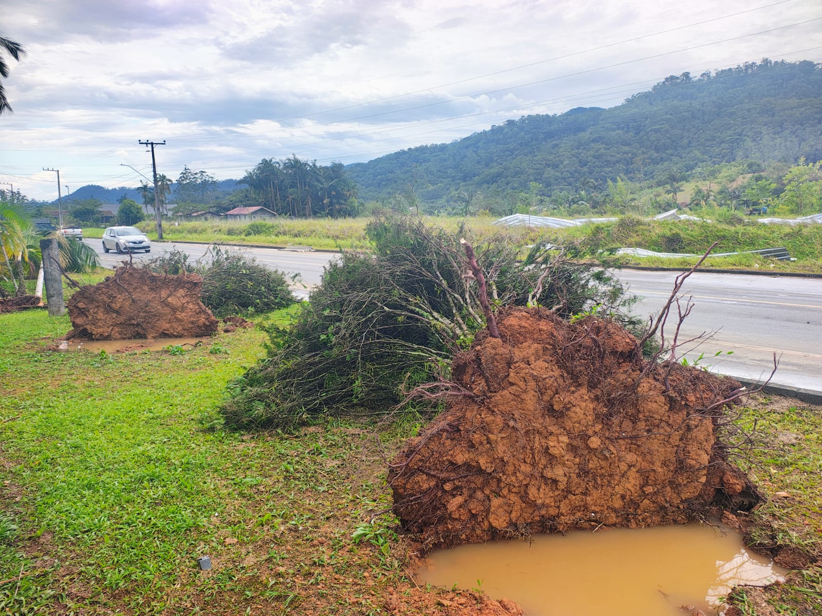 Após o forte calor registrado ao longo do dia, os bairros Rio Cerro II e Rio Cerro I, em Jaraguá do Sul, foram atingidos por um forte temporal acompanhado de ventos intensos. A força do vento provocou queda de árvores arrancadas pela raiz, postes derrubados, além de destelhamentos em residências e empresas, causando grandes prejuízos na região.