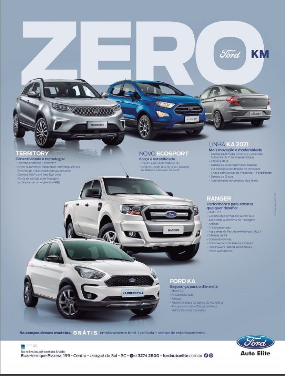 A Ford Auto Elite fica na rua Henrique Piazera, 199, no Centro de Jaraguá do Sul. Entre em contato pelo telefone (47) 3274-2800 e acompanhe as novidades pelo Facebook ou Instagram da loja.