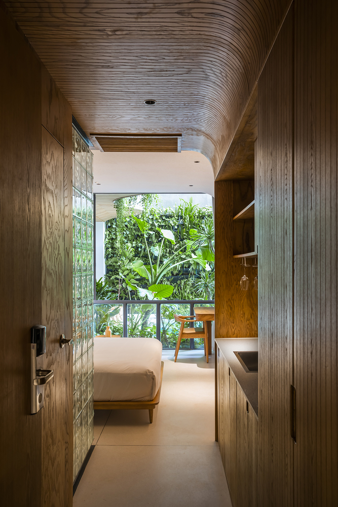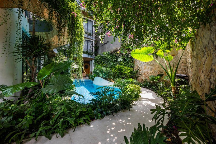 Exuberantes plantas tropicais caem das varandas onduladas desse edifício, criando uma fachada verde que oferece ar fresco e uma atmosfera relaxante. O grande vazio no terreno de 320 m² apresenta uma piscina curva onde os visitantes podem mergulhar em um ambiente tranquilo.