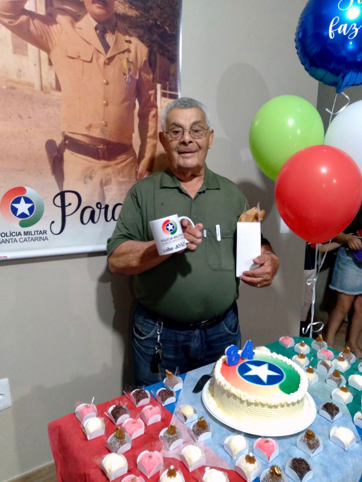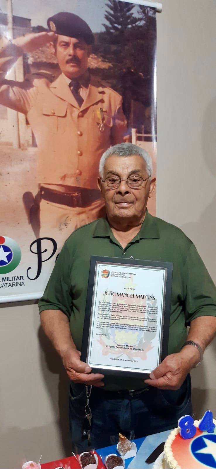 O cabo da reserva remunerada da Polícia Militar de Santa Catarina (PMSC), João Manoel Martins, completou nesta terça-feira 84 anos. Na ocasião, o filho dele e atual comandante da PM do município de Siderópolis, 3º sargento Everaldo Martins, e seus comandados, aproveitaram para homenageá-lo com uma placa em reconhecimento aos serviços prestados no município.