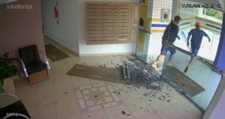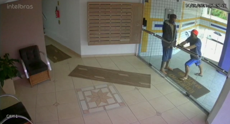 Dois criminosos, em plena luz do dia, pouco antes das 17h30min, acessam a escada do imóvel e espiam pela porta de vidro. Em seguida, um deles tenta arrombar a porta e acaba estilhaçando o vidro, fugindo do local em seguida com o comparsa.