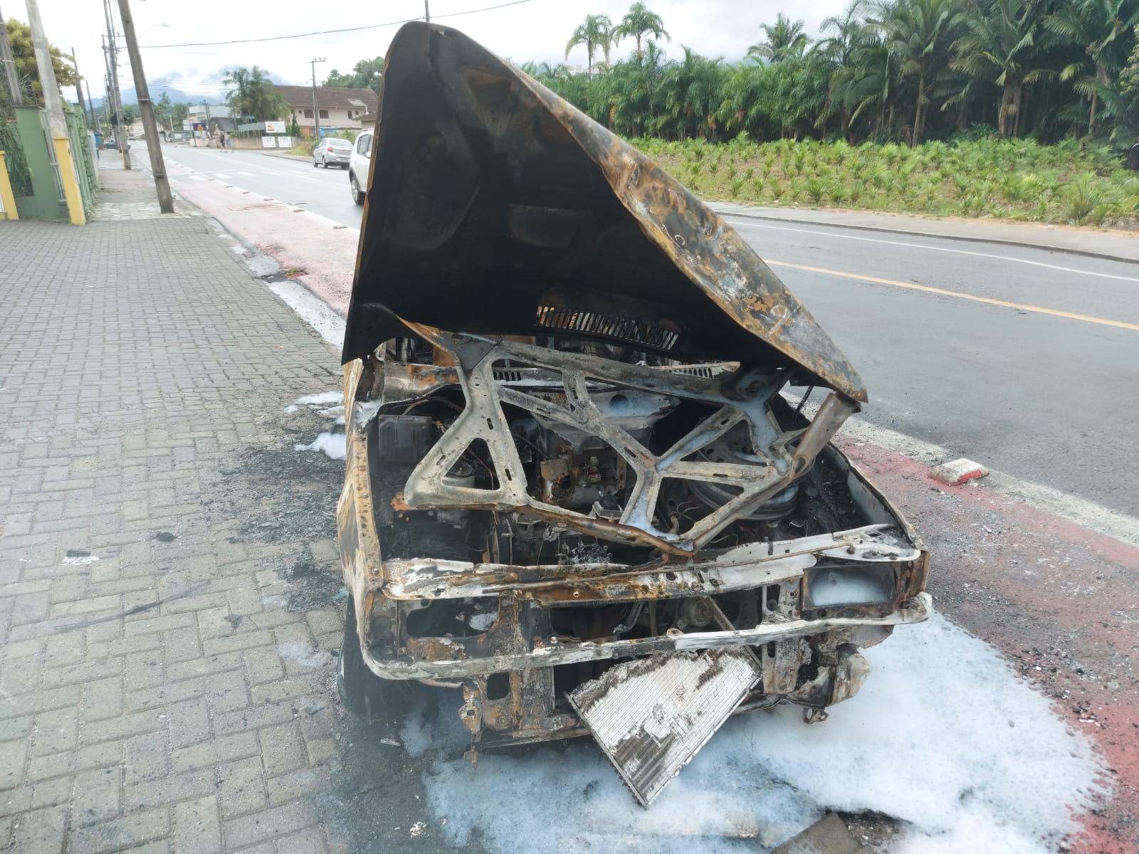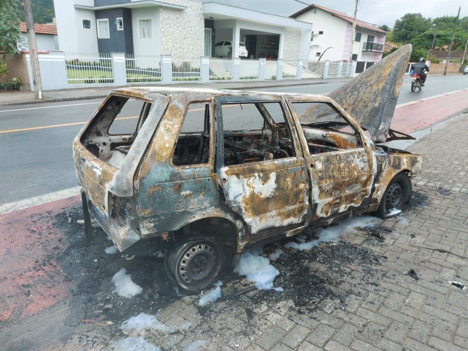 O veículo pegou fogo na rua Bertha Weege, no bairro Jaraguá 84, e