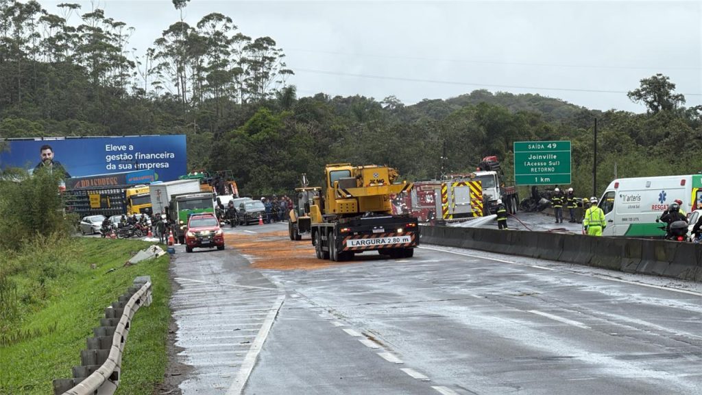 Após caminhão tombar e provocar incêndio, BR-101 é liberada em Joinville