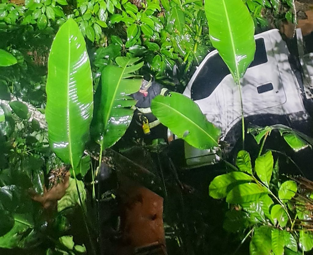 Caminhão cai em vala após colisão com carro em Jaraguá do Sul