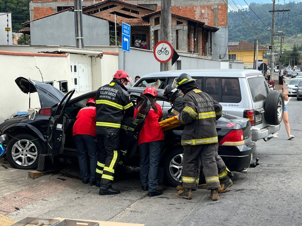 Colisão entre carros deixa dois feridos e veículos atingem muro em Jaraguá do Sul