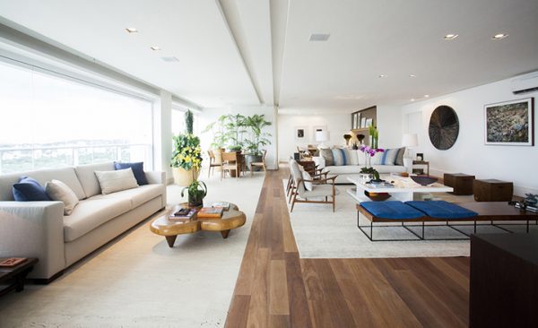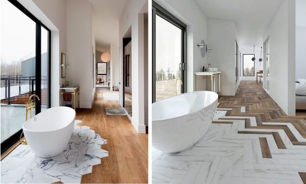 Já se você for mais ousado, há uma infinidade de combinações que podem ser feitas, por exemplo, pisos de mármore + porcelanato com padrões amadeirados, ladrinho + tacos de madeira, pisos com formatos diferentes + madeira, cimento queimado + madeira, e por aí vai.