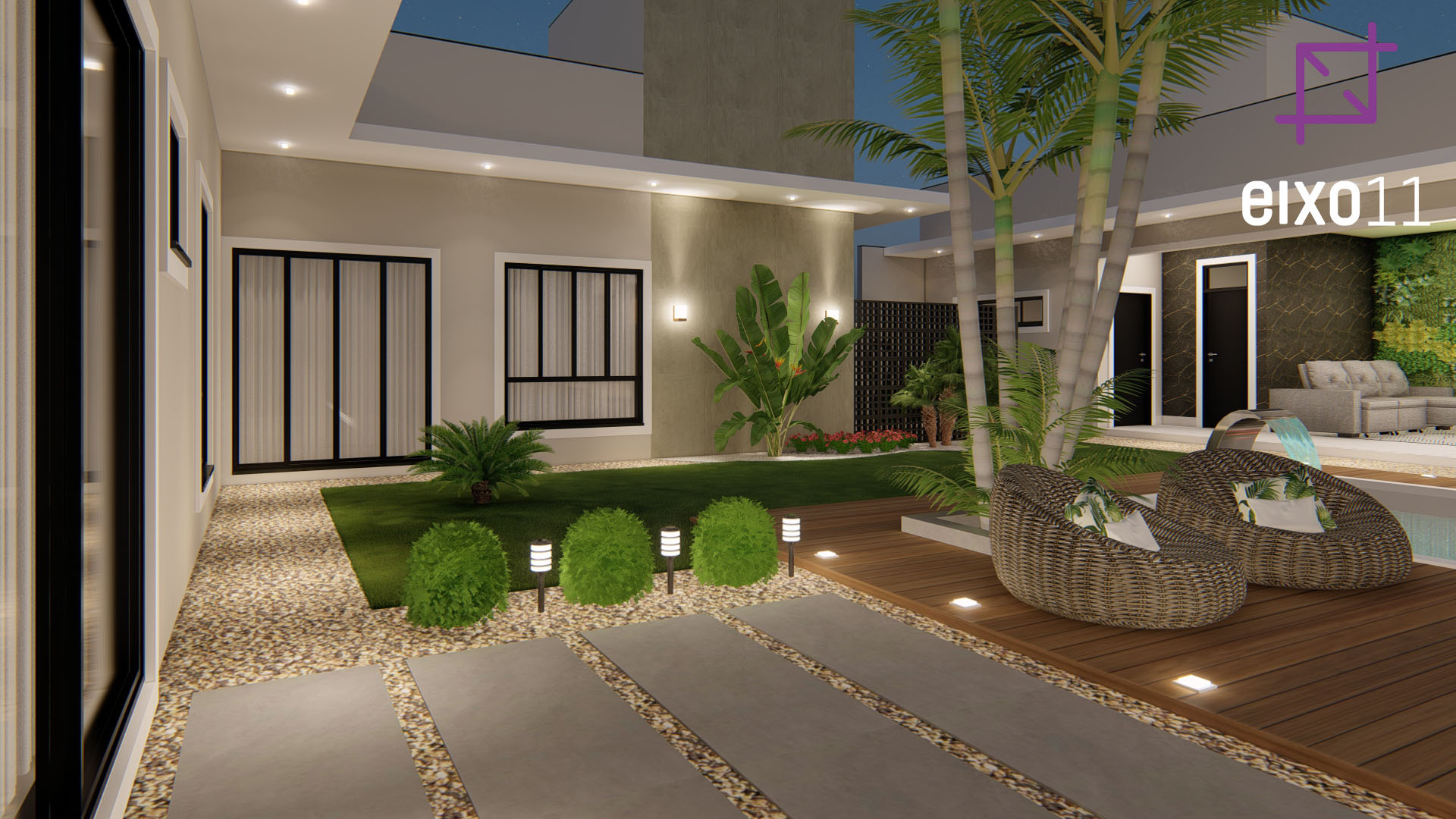 Integre a iluminação da paisagem com a iluminação da fachada para criar uma transição suave entre o ambiente externo e a casa.