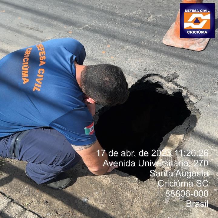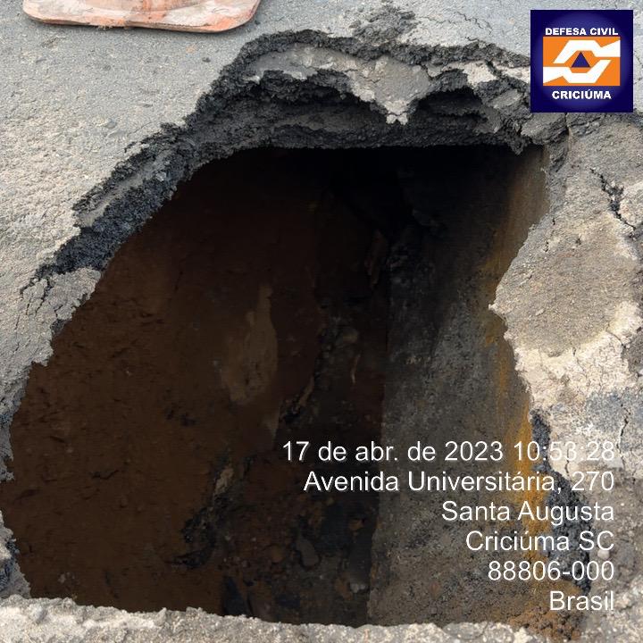 A Defesa Civil de Criciúma atua, desde a manhã desta segunda-feira, no reparo de uma cavidade na ponte sobre a Avenida Universitária, no bairro Santa Augusta.