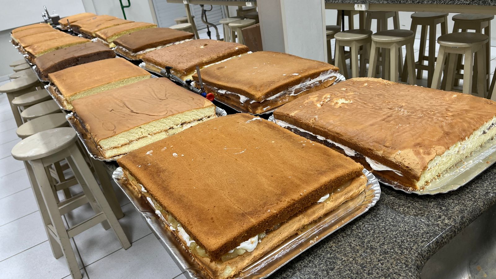 Os trabalhos começaram na manhã desta quinta-feira e serão finalizados na sexta de manhã. Como ocorre tradicionalmente, os recheios e coberturas dos bolos serão variados. Os pedaços serão distribuídos gratuitamente para qualquer pessoa que participar da festa na Arena Jaraguá.
