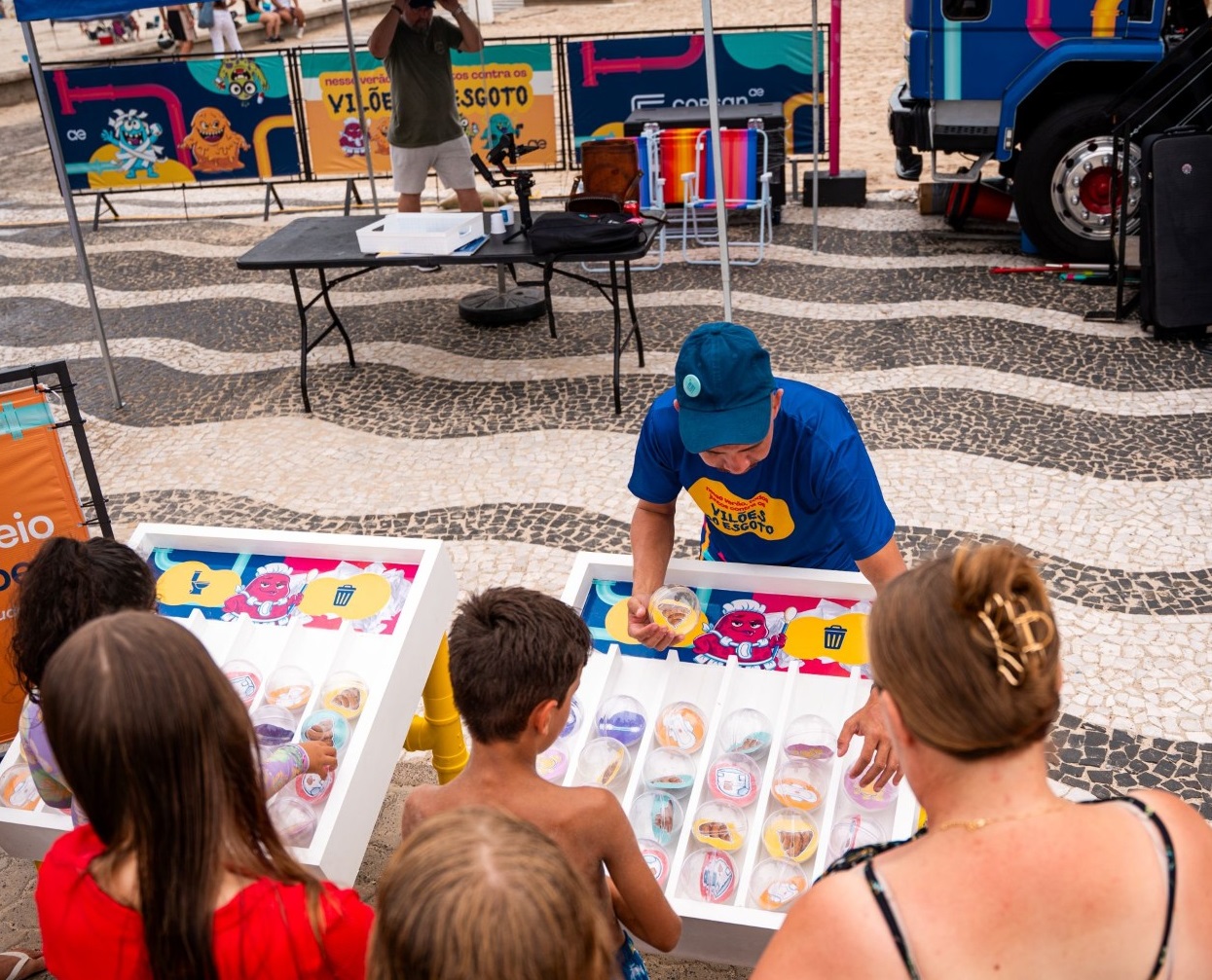 Para celebrar a participação, os “heróis” recebem brindes variados, bolas, chaveiros, brinquedos de praia e tatuagens educativas, que funcionam como selos simbólicos de cidadãos conscientes que combatem os vilões do esgoto e cuidam da água.