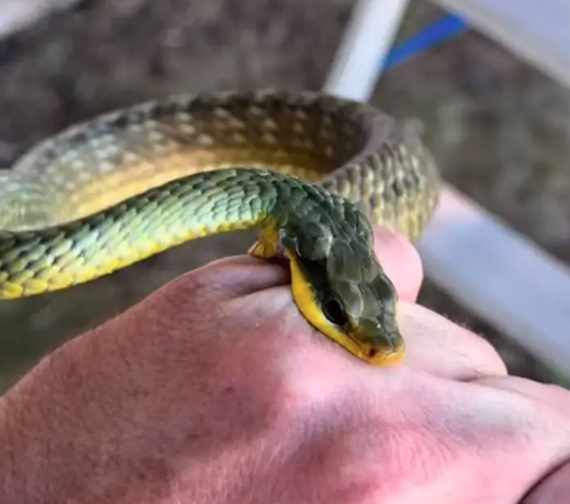 O pequeno ofídeo foi encontrado em uma árvore dentro da unidade escolar.