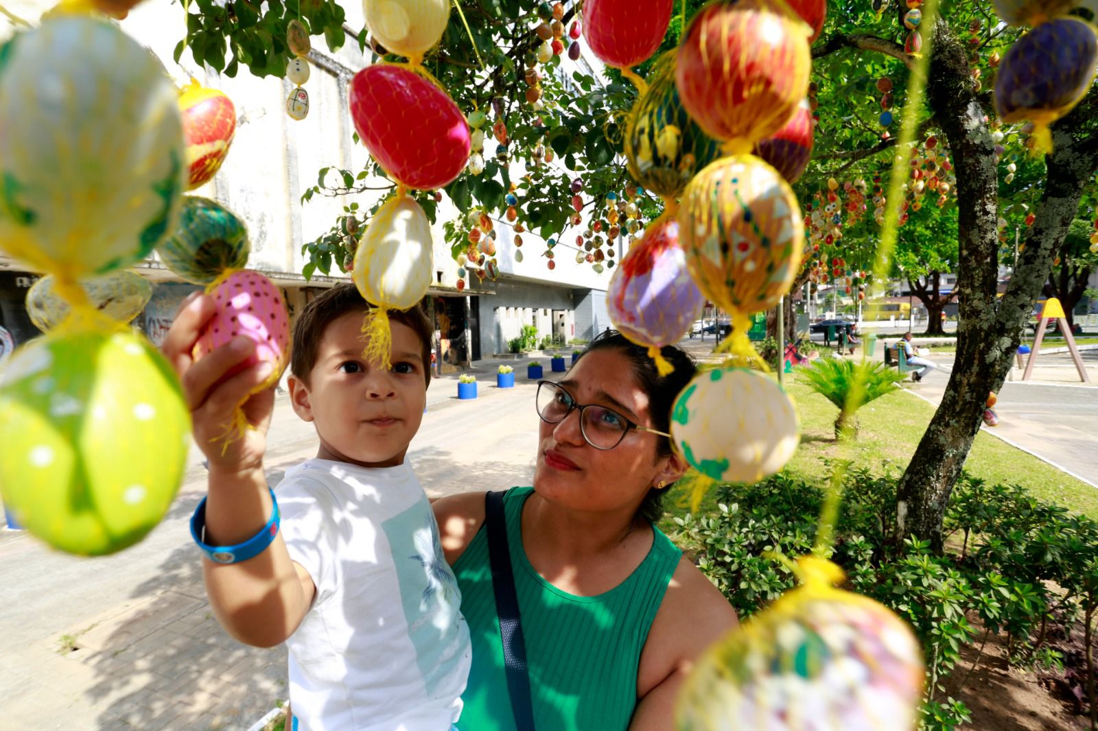 “Ele brinca sempre na Praça Lauro Müller e eu li que ela seria decorada para a Páscoa. Já estava programando vir aqui e aproveitar a programação, mas hoje, quando viu o coelho, ele se soltou da minha mão e correu porque precisava chegar perto”, conta Laura.
