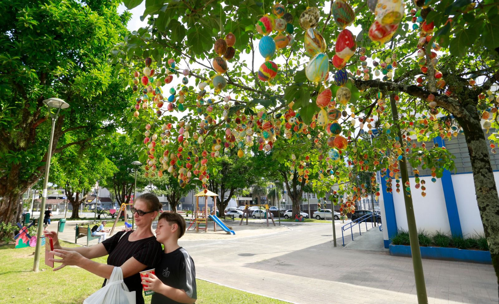 Em uma das árvores, casquinhas de ovos coloridas por crianças e adolescentes joinvilenses transformam a árvore em frente à Biblioteca Pública Municipal Prefeito Rolf Colin em uma Osterbaum.
