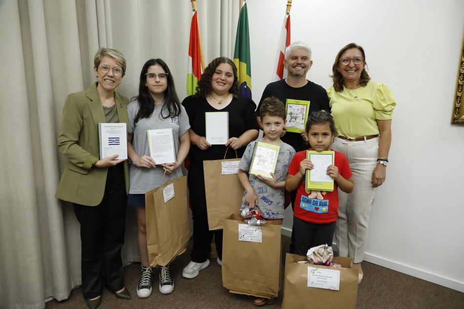 Os estudantes foram até a Prefeitura de Blumenau acompanhados dos pais e foram surpreendidos ao descobrir que as produções artísticas e textuais estamparão a agenda que será distribuída para toda a Rede Pública Municipal de Ensino no ano letivo de 2026.