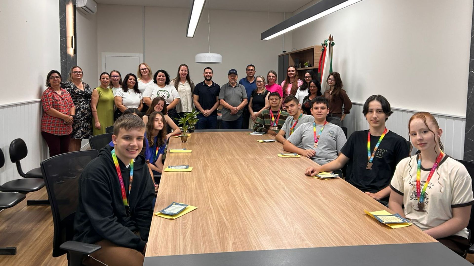 A entrega das medalhas ocorreu no gabinete do prefeito Eddy Edgar Eipper e contou com a presença do vice-prefeito Felipe Rafaeli Rodrigues, diretoras das unidades escolares e professores. A Administração Municipal parabenizou os alunos pelo desempenho e destacou o trabalho dos professores de Matemática Débora Stizz, Felipe Rafaeli Rodrigues, Rubian Hafemann Moretti e Simone Regina Eidt, fundamentais para os resultados alcançados.
