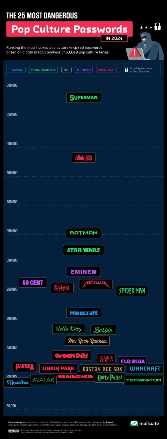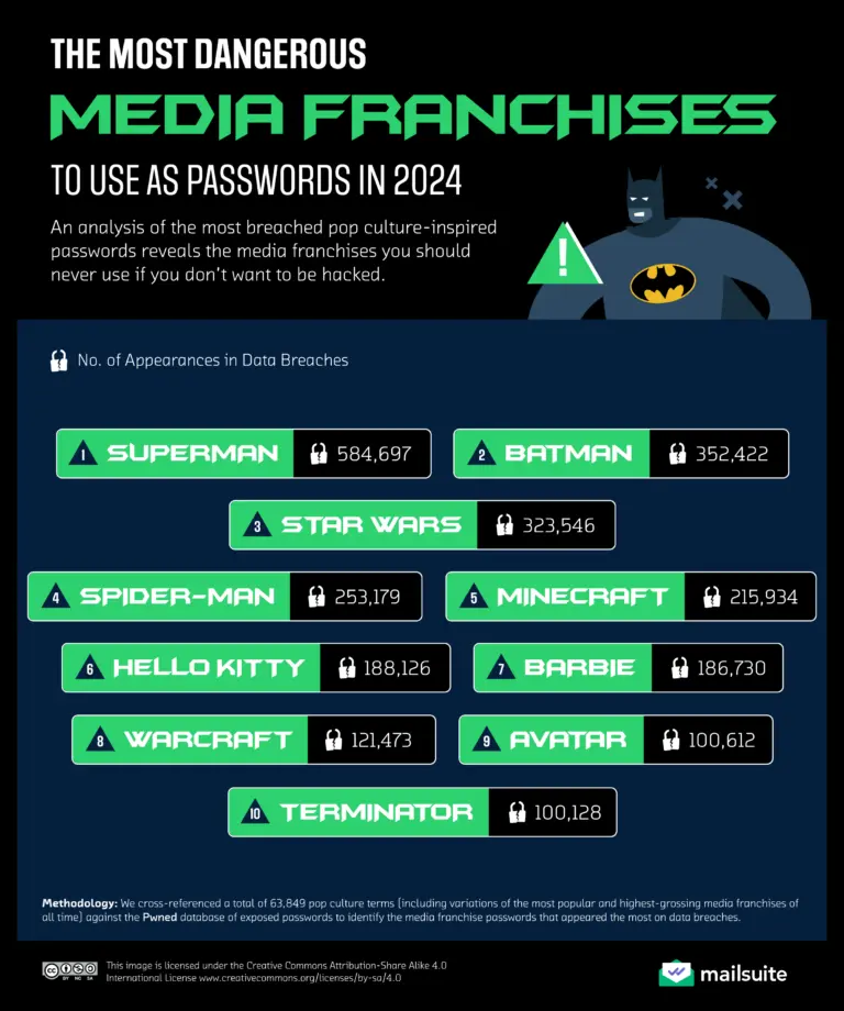 Um estudo da empresa de serviços de e-mail Mailsuite revelou os riscos no uso de senhas inspiradas na cultura pop e demonstrou a fraqueza destas senhas. A companhia analisou milhões de senhas com nomes ou palavras de cultura pop mais expostas em violações de dados, e descobriu que ‘Superman’ apareceu em 584.697 violações de segurança.