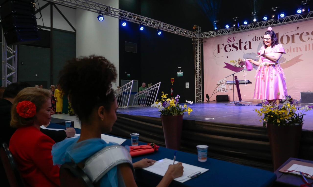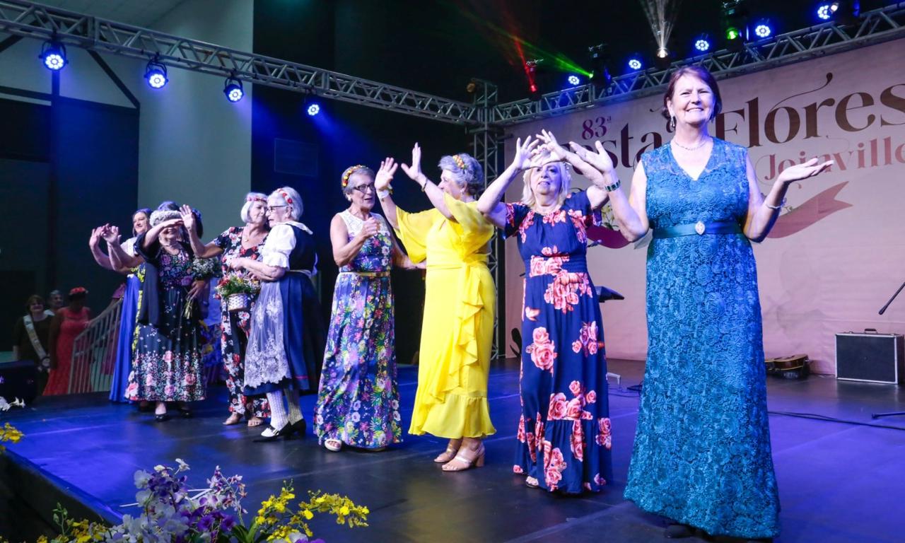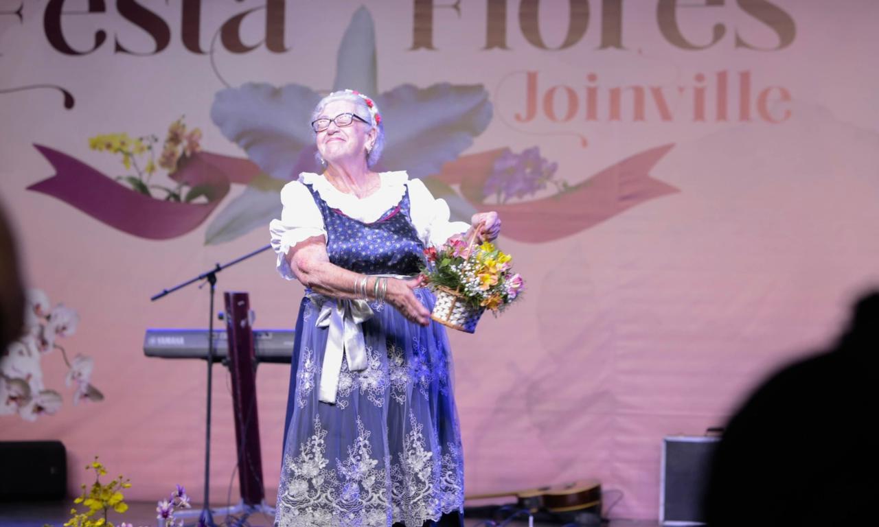 O grande momento foi a revelação da Flor da Melhor Idade da Festa das Flores 2023. A coroa e a faixa foram para Maria Aparecida da Silva, de 64 anos, de Itajaí, do grupo Terapias Naturais. Maria Aparecida é costureira e ela mesma fez o vestido rosa com que desfilou.