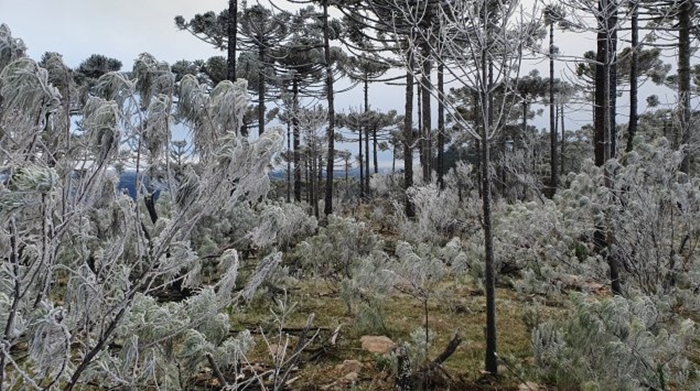 Ainda na sexta-feira (5), São Joaquim viu outro fenômeno do inverno, que não deixa de ser tão belo e é igualmente comemorado pelos turistas. A temperatura negativa fez as árvores do município amanhecerem congeladas, deixando um típico cenário europeu.
