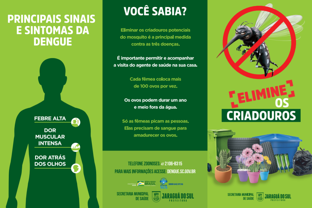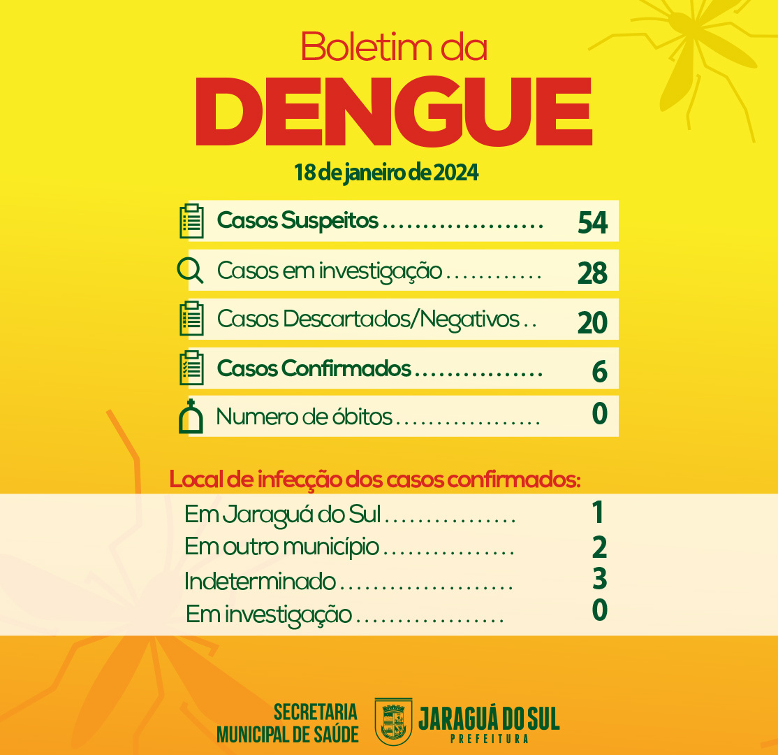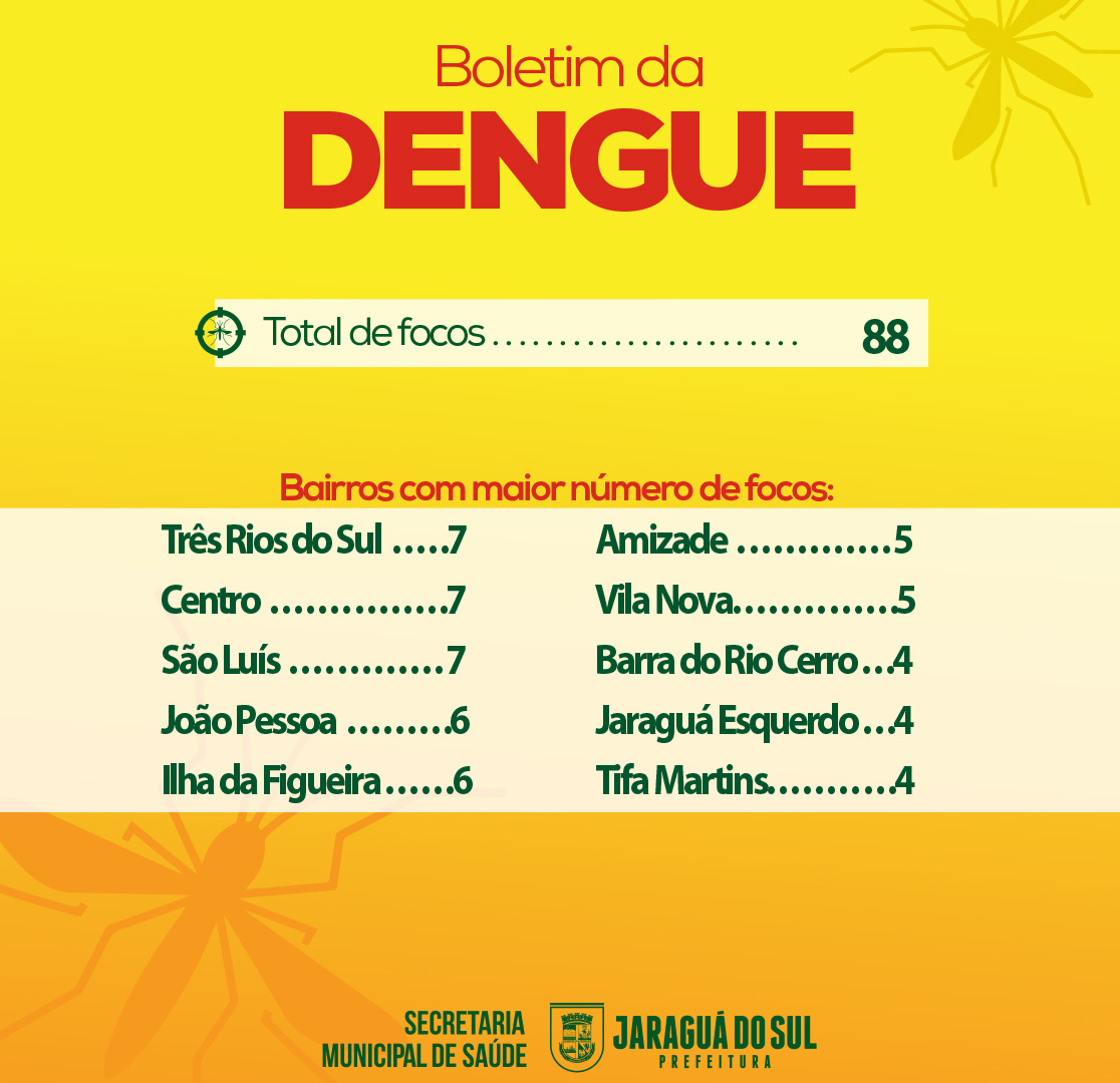 A Prefeitura de Jaraguá do Sul, por meio da Secretaria Municipal de Saúde, divulgou nesta quinta-feira (18) mais um boletim da dengue, com os números atualizados da semana.