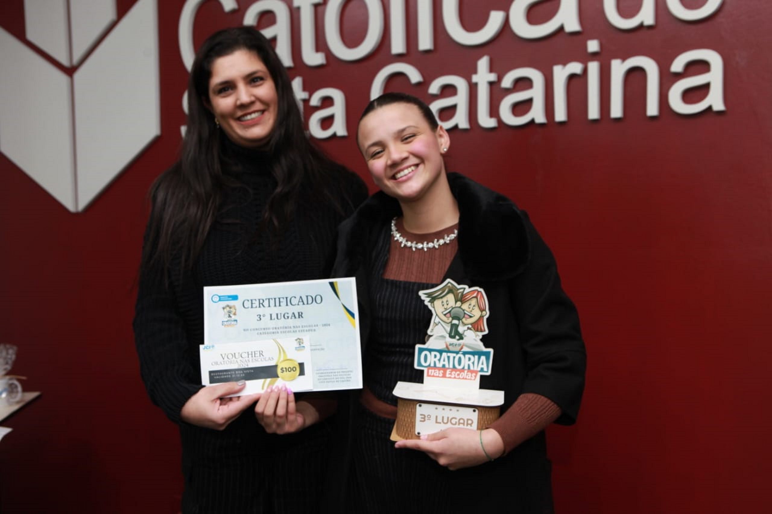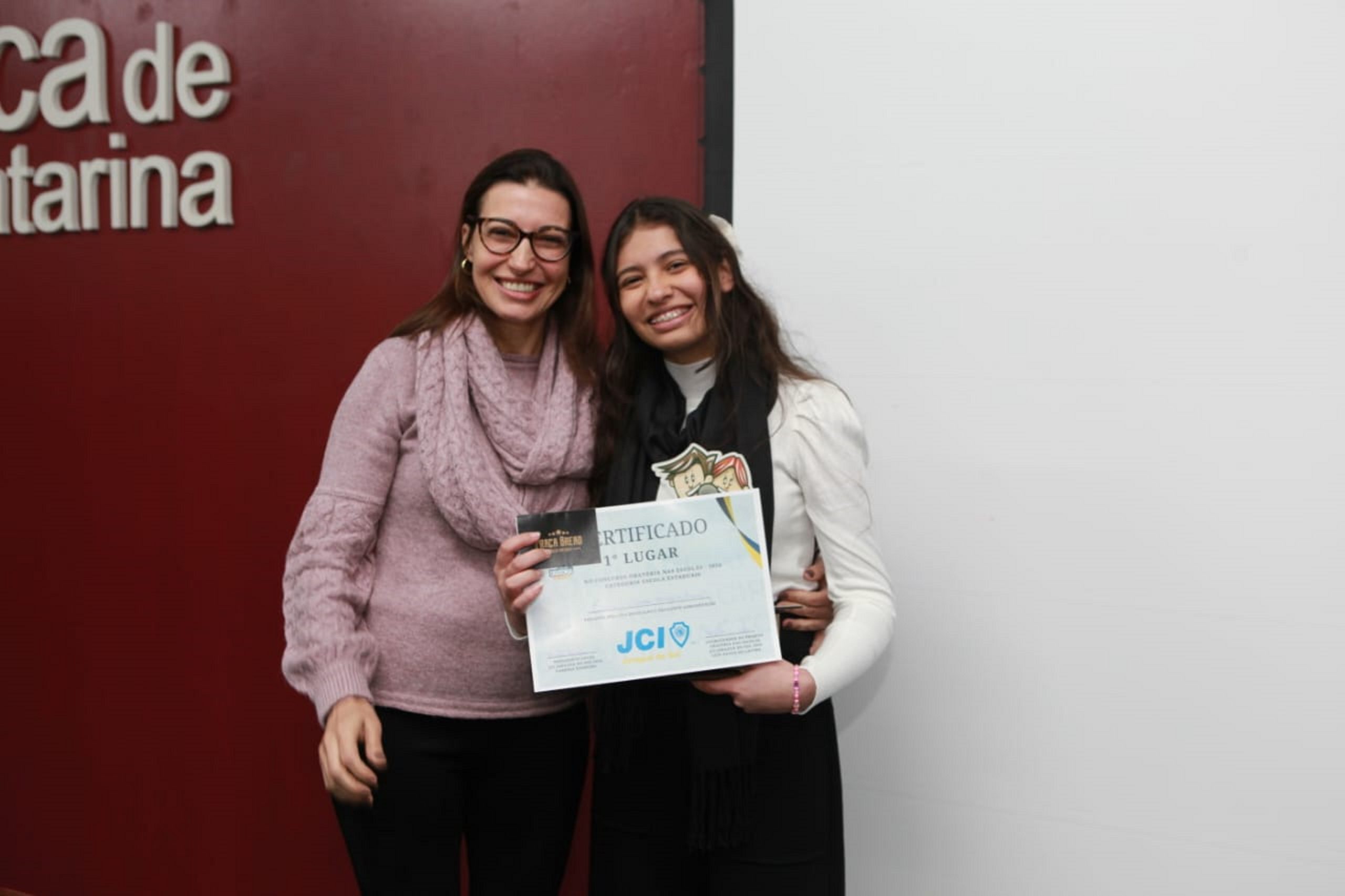 - 2° lugar: Bruna Burzi, da Escola de Ensino Médio Professora Darci Franke Welk. Ela recebeu uma bolsa de estudos de 50% no Centro Universitário Católica de Santa Catarina e um voucher de almoço para o Restaurante Temperos da Cida.