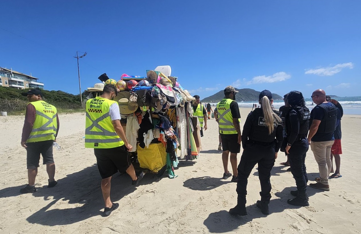 A Prefeitura de Florianópolis realizou nesta quinta (20) e sexta-feira (21) operações de fiscalização de comércio ambulante em praias do Norte da Ilha, com foco em Jurerê e no Santinho. As ações foram coordenadas pela Secretaria Municipal de Segurança e Ordem Pública, por meio da Guarda Municipal e Fiscalização de Serviços Públicos, em parceria com a Polícia Militar.