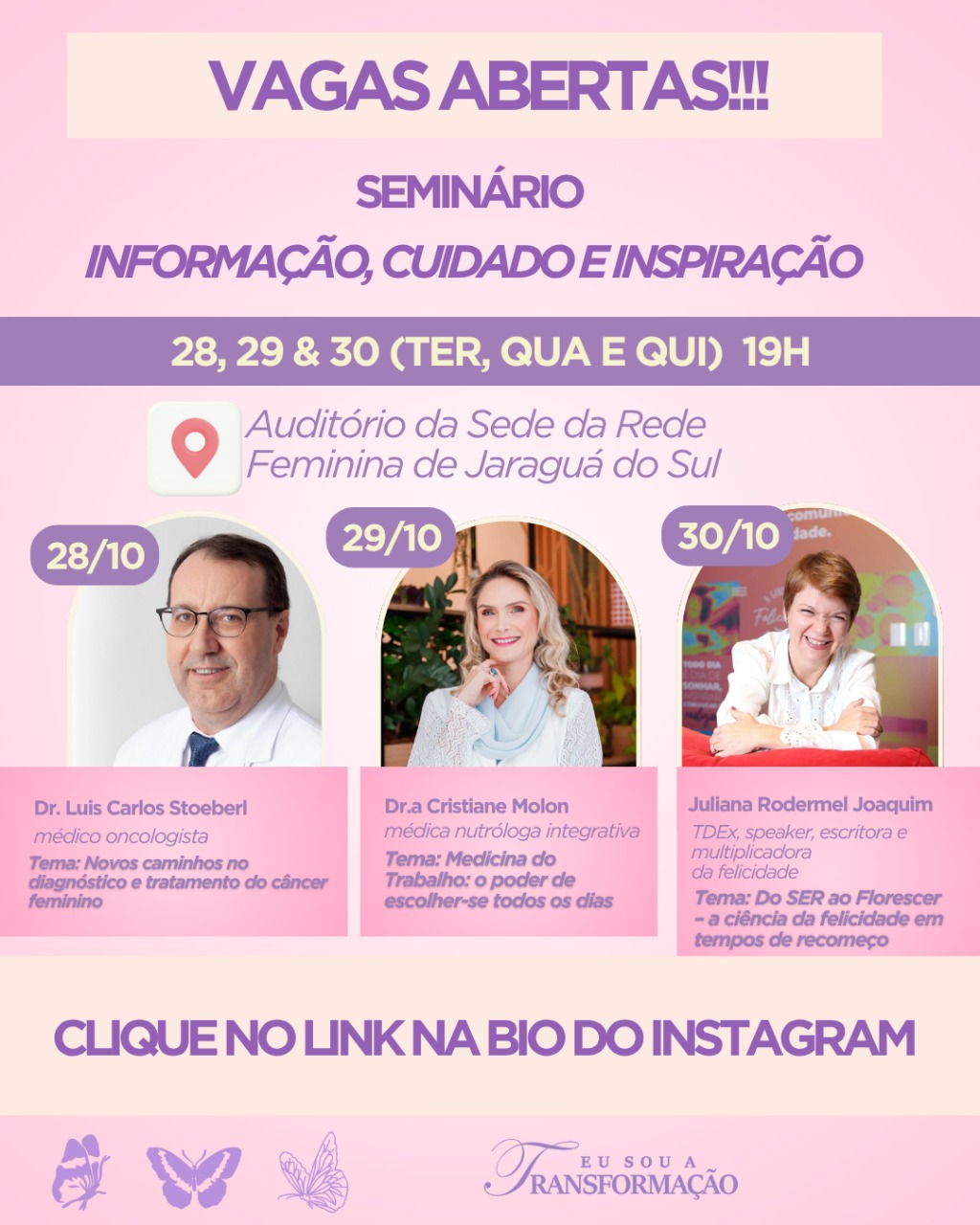 Serão três noites especiais, com palestrantes inspiradores e temas que unem conhecimento, saúde, autocuidado e bem-estar: