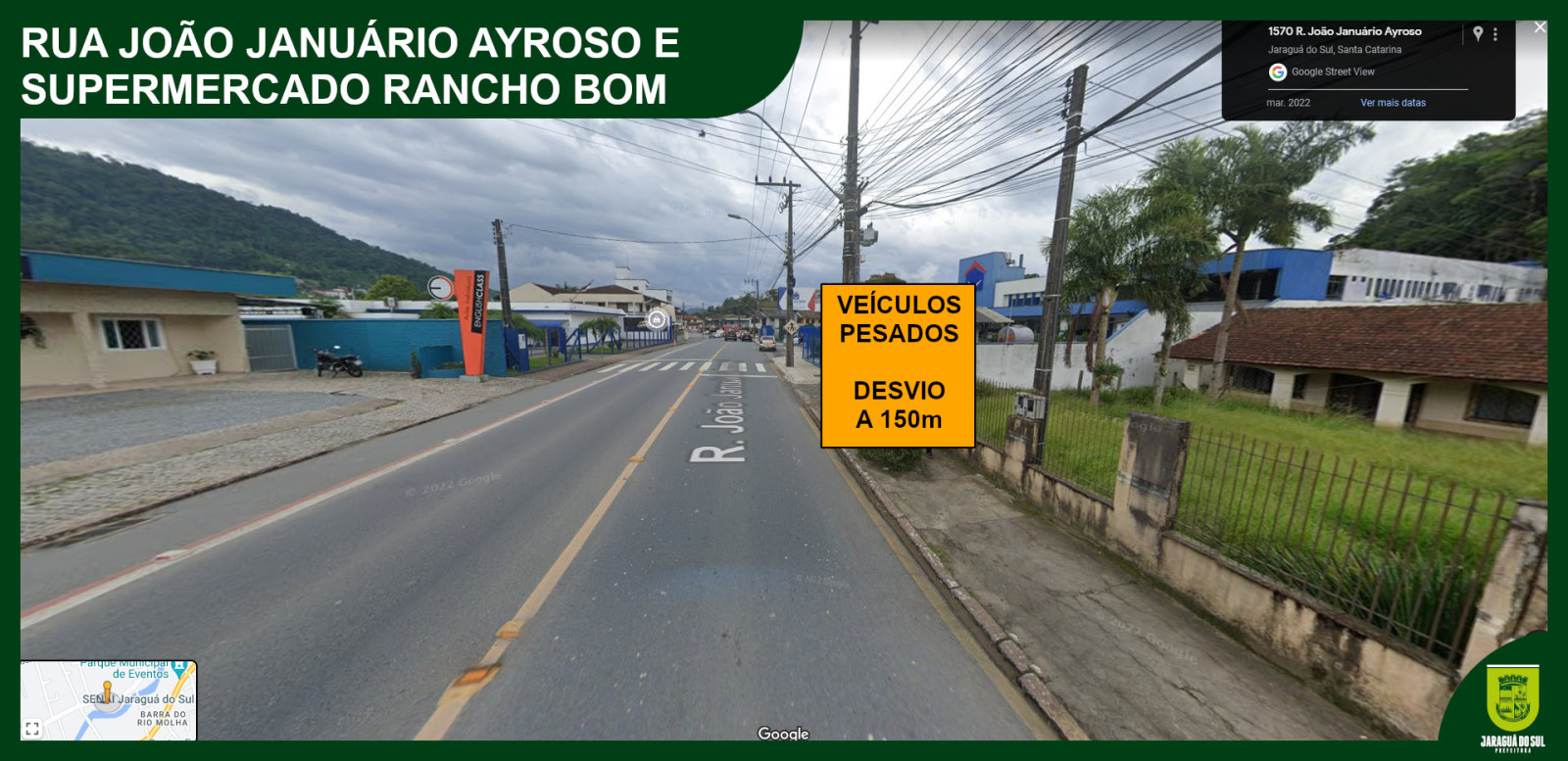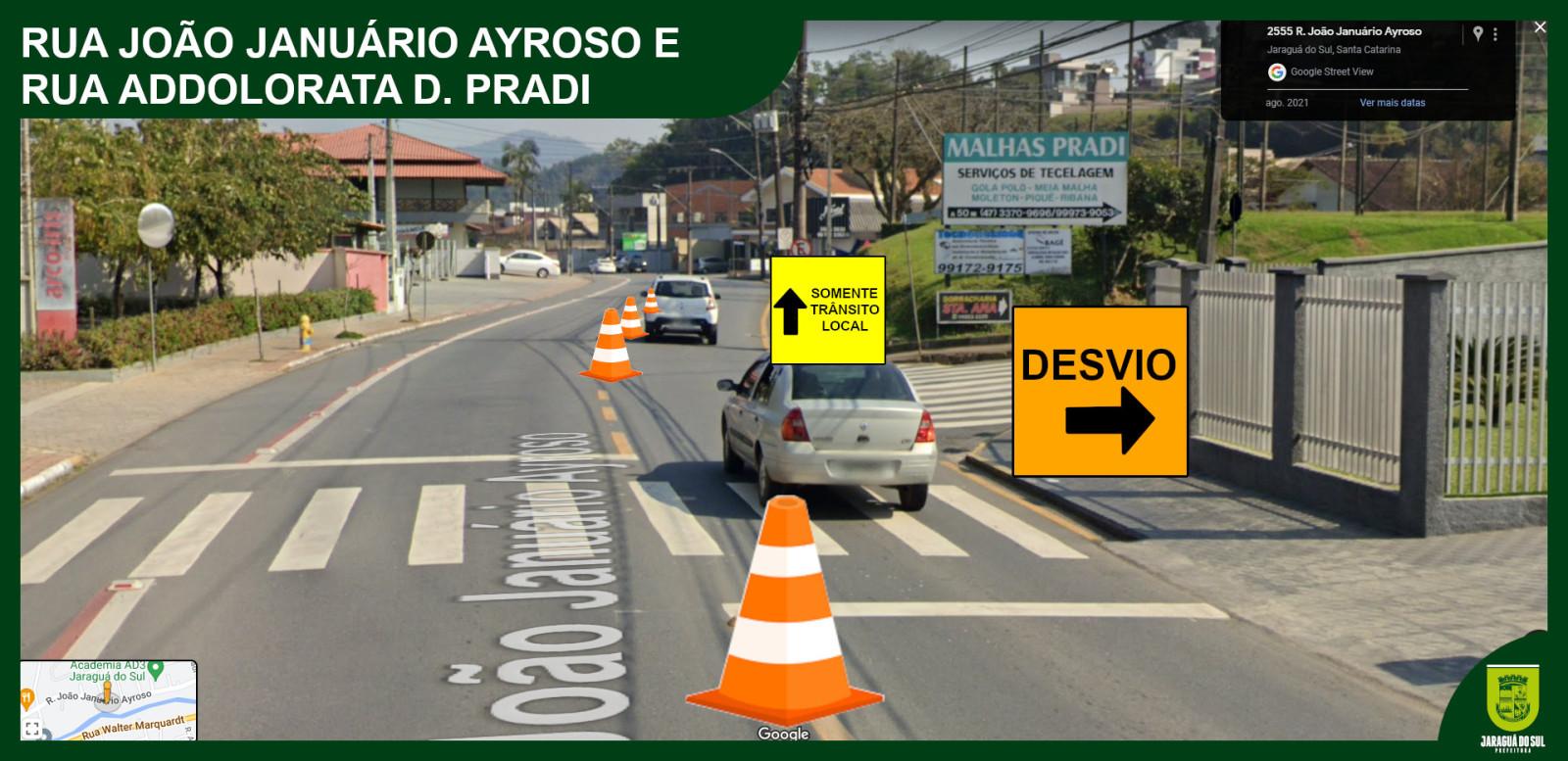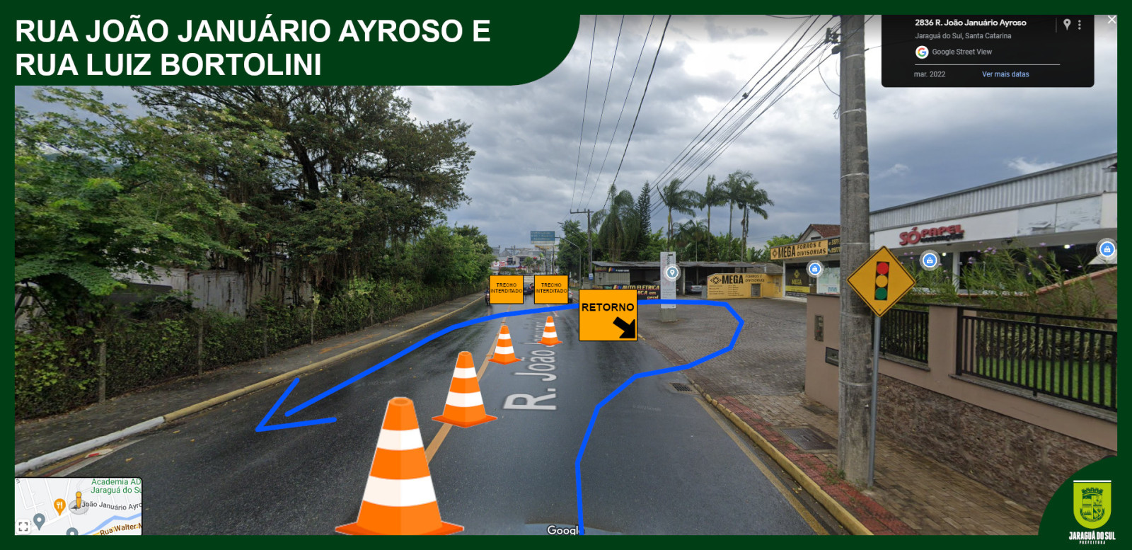A Prefeitura de Jaraguá do Sul, por meio da Diretoria de Trânsito e Transportes da Secretaria de Planejamento e Urbanismo e da Secretaria Municipal de Obras e Serviços Públicos, comunica que, a partir da próxima quinta-feira (23), a Rua João Januário Ayroso, no Bairro Jaraguá Esquerdo, ficará totalmente interditada na interseção com as ruas Luiz Bortolini e Enrico Fermi (próximo ao estacionamento à Urbano Alimentos).