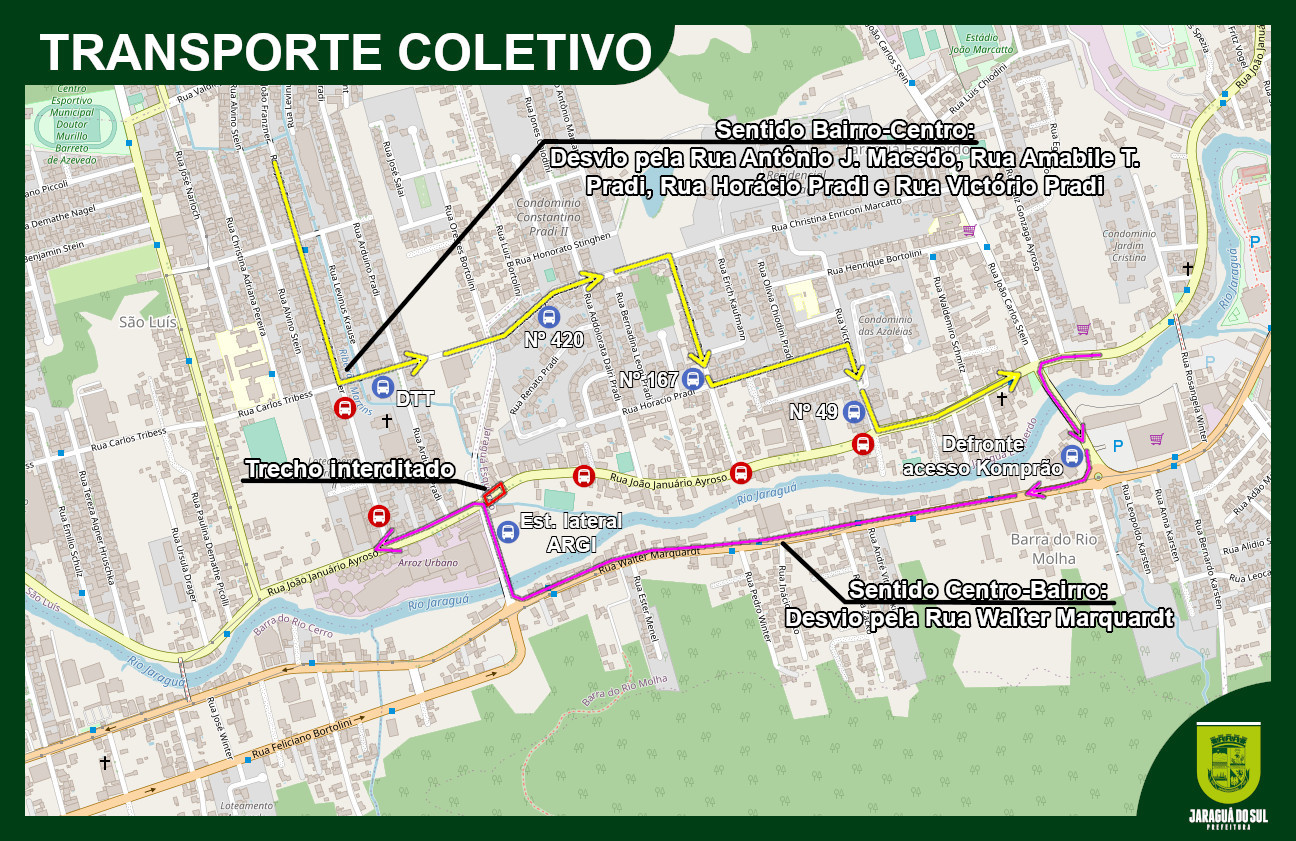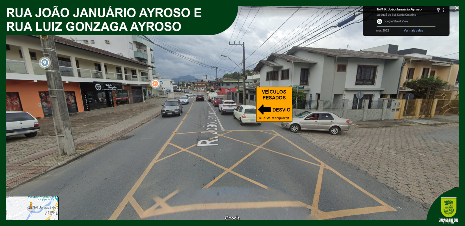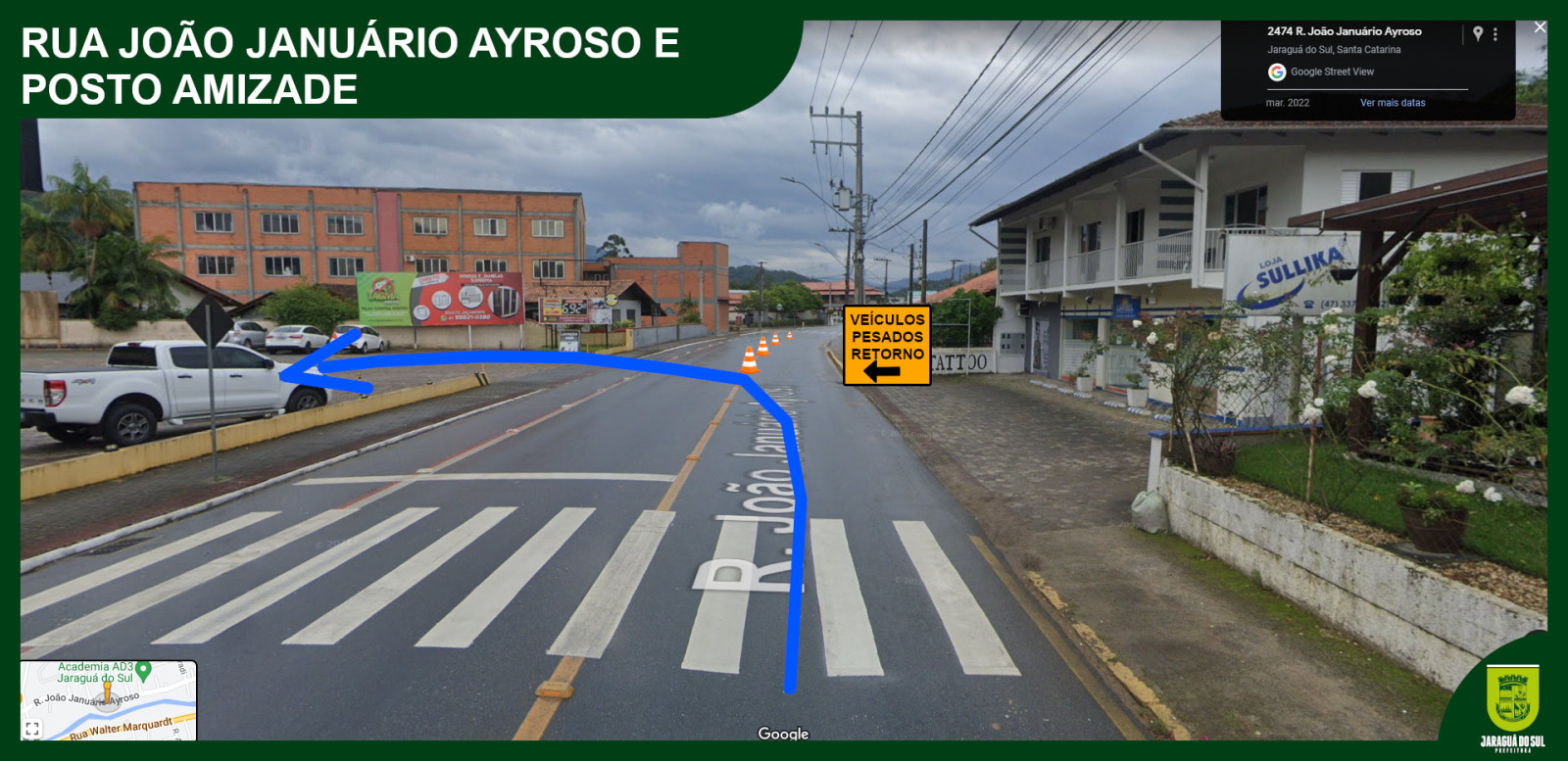 A Prefeitura de Jaraguá do Sul, por meio da Diretoria de Trânsito e Transportes da Secretaria de Planejamento e Urbanismo e da Secretaria Municipal de Obras e Serviços Públicos, comunica que, a partir da próxima quinta-feira (23), a Rua João Januário Ayroso, no Bairro Jaraguá Esquerdo, ficará totalmente interditada na interseção com as ruas Luiz Bortolini e Enrico Fermi (próximo ao estacionamento à Urbano Alimentos).