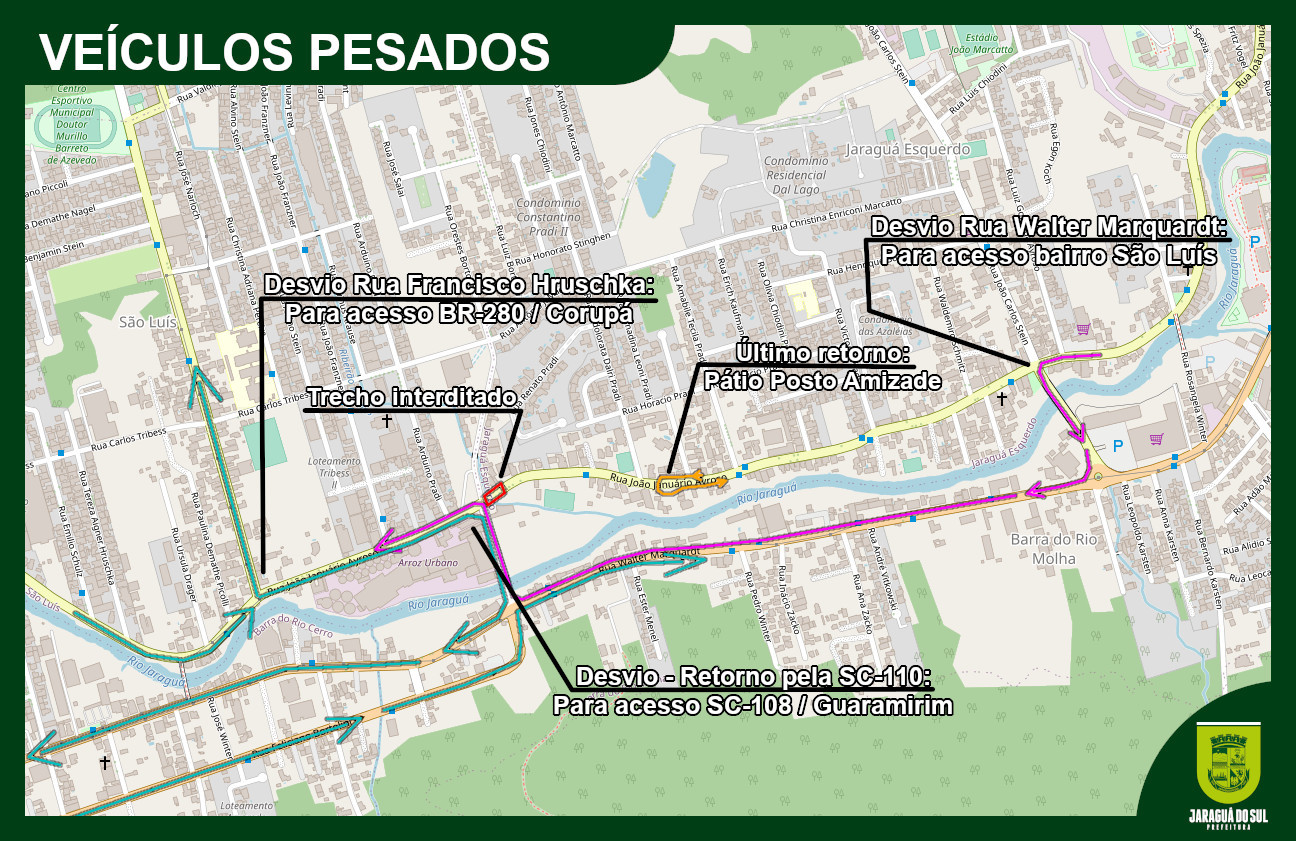 – Veículos pesados: os veículos pesados que desejam acessar o Bairro São Luís ou seguir em direção à região da Barra do Rio Cerro ou município de Pomerode, devem acessar à esquerda no semáforo da Ponte do Curtume, indo pela Rua Ottilia Prim Schmitt e Rua Walter Marquardt. Caso seja necessário o atendimento a algum comércio ou residente no trecho seguinte da Rua João Januário Ayroso, poderão seguir até a altura do Posto Amizade, onde o pátio será temporariamente utilizado como retorno. Funcionários da empresa contratada e fiscais da Prefeitura estarão no local, orientando os motoristas e verificando possíveis exceções.