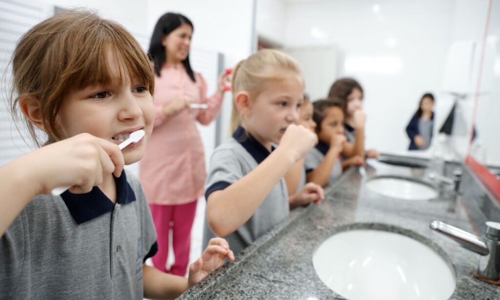 Após receberem explicação sobre a importância dos cuidados diários, as crianças são acompanhadas pela equipe e fazem a escovação de dentes supervisionada, com a aplicação tópica de flúor.