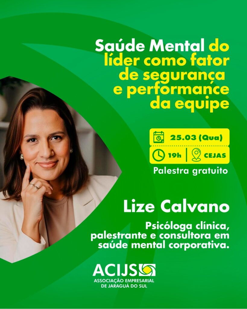 Pensando na importância de ampliar cada vez mais as discussões sobre o assunto, a Acijs realiza no dia 25 de março palestra com a psicóloga Lize Calvano. O evento abre a programação de palestras gratuitas em que os associados compartilham suas experiências junto a empreendedores e gestores de todas as áreas na região.