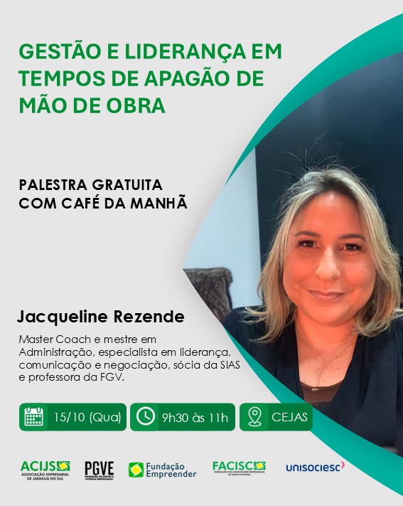 Alinhada a esse contexto, a Acijs realiza nesta quarta-feira (15) a palestra “Gestão e Liderança em Tempos de Apagão de Mão de Obra”, evento que integra o Programa de Gestão e Vivência Empresarial (PGVE).