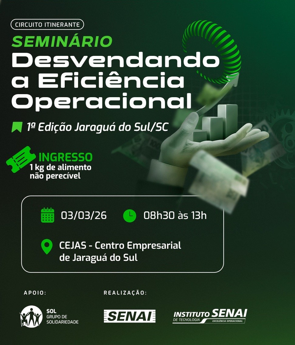 O Senai de Santa Catarina realizará em Jaraguá do Sul, no dia 3 de março, o Seminário “Desvendando a eficiência operacional” com o objetivo de debater práticas que impulsionam a competitividade do setor produtivo.