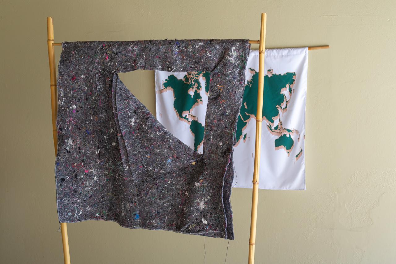 Da mesma forma, a vice-presidente, Maria Esmênia, traz “Manifesto da Fresta”, instalação composta de um cobertor tomara que amanheça e um mapa-mundi impresso sobre tecido em um suporte de bambu sustentado por pés de concreto. “Neste trabalho, trago minhas inquietações e as exponho sobre varais, preservando as referências do artista e contextualizando minha obra no atual momento político, social e econômico mundial, em uma referência aos milhões de pessoas que vivem em situação de rua, fruto das desigualdades sociais e da má distribuição da renda”, reflete ela.