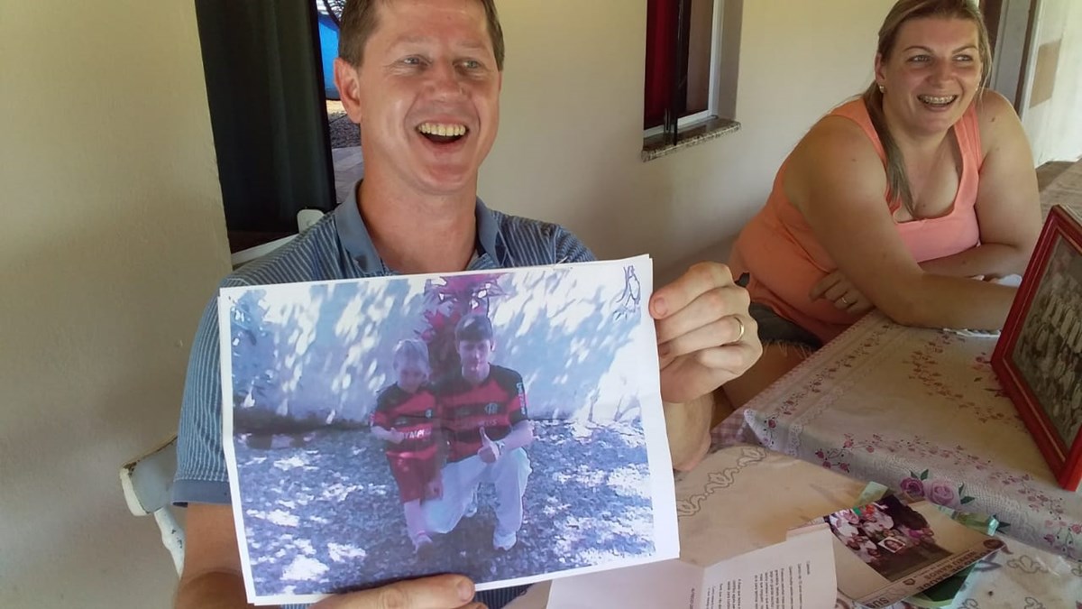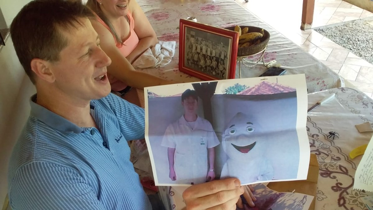 ”Eu encontrei algumas fotos, uma com minha filha, os dois com a camiseta do Flamengo. Eu já torcia pro Flamengo naquela época e milha filha hoje se diz gremista. Também uma foto com o Zé Gotinha, porque eu era o vacinador, algumas fotos do grupo, da equipe de saúde e tinha dinheiro também”, descreve Alfredo.
