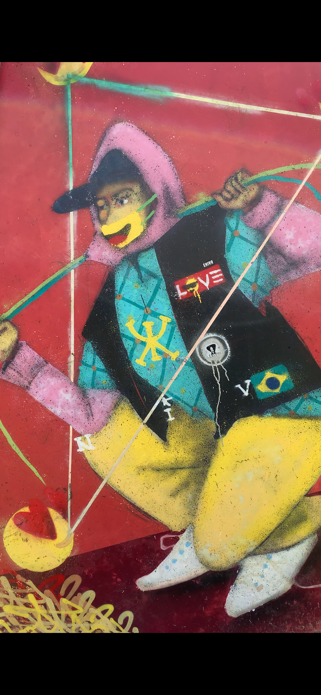 Na rua 25 de julho a parede externa do restaurante Bamboleio virou arte: um mural de seis metros de altura por quase doze de largura, foi resultado de um trabalho em dupla, desenvolvido por Kauê Felipe Bento e Abraão Souza.