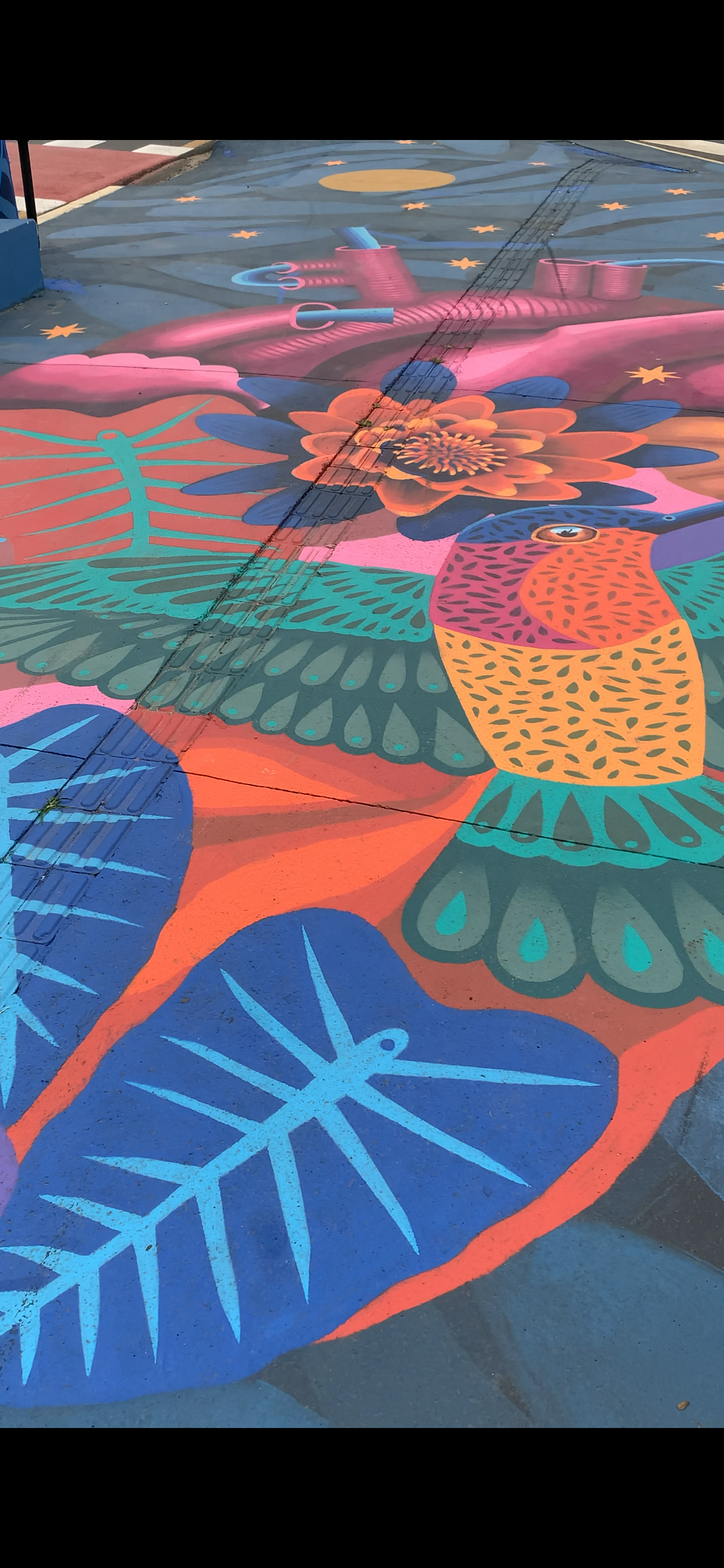 Na ciclovia, atrás da praça Ângelo Piazera, uma pintura gigante transformou uma parede antes sem vida, em um mural cheio de arte e cor.
