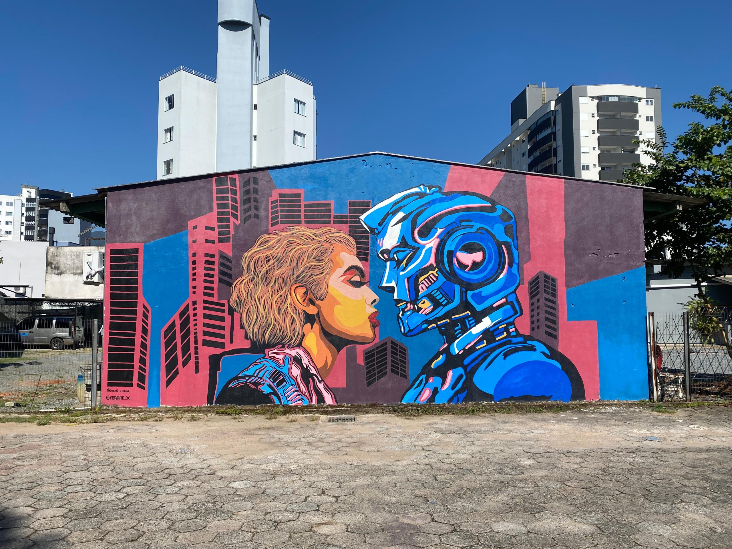 Logo na entrada do Parque da Inovação, o prédio do Instituto Eggon João da Silva chama a atenção com sua fachada vibrante, marcada por um grafite impactante. A obra, criada pelos artistas Rafael Sliks e Marcus Vinícius Enivo, é um convite visual à criatividade e à expressão urbana, transformando o local em um ponto de destaque cultural.