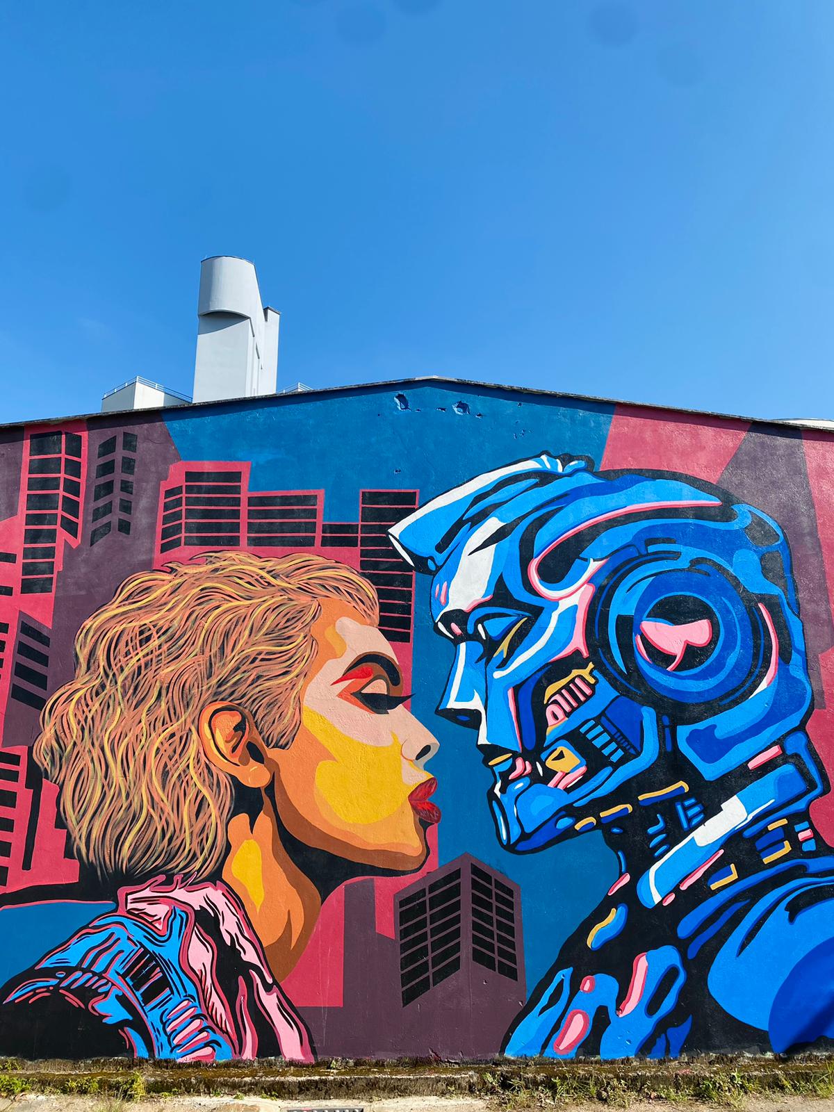 A checagem constante de notificações e o uso exagerado das redes sociais podem causar transtornos de ansiedade, de atenção, estresse e também gerar uma dependência ou obsessão digital – representada na obra pelo interesse da mulher que se aproxima do robô para beijá-lo.