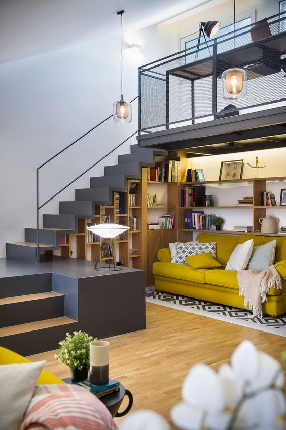 Os locais onde há escadas, muitas vezes se tornam um espaço negativo, sem muita função. Adicionar prateleiras variadas e acomodar livros, então, parece ser a solução perfeita. Uma dica é optar por exemplares de cores parecidas ou com cores contrastantes, criando um visual mais rico ao ambiente.