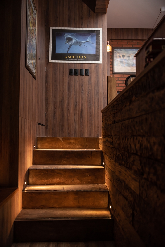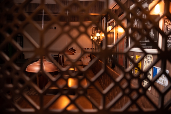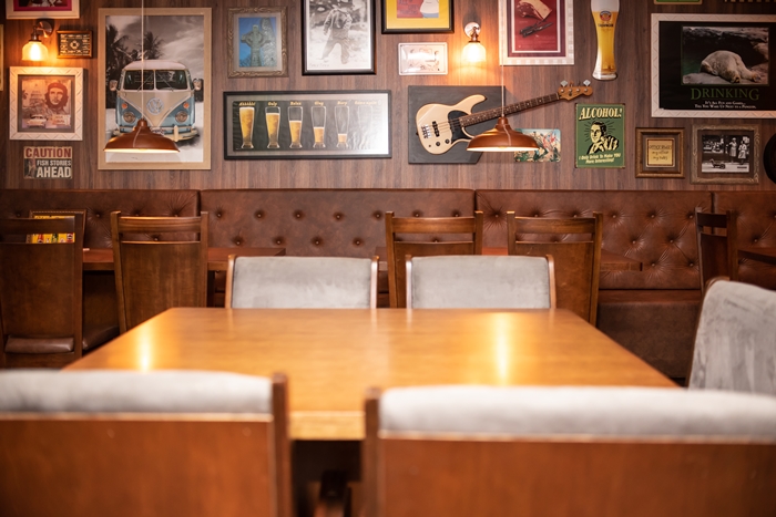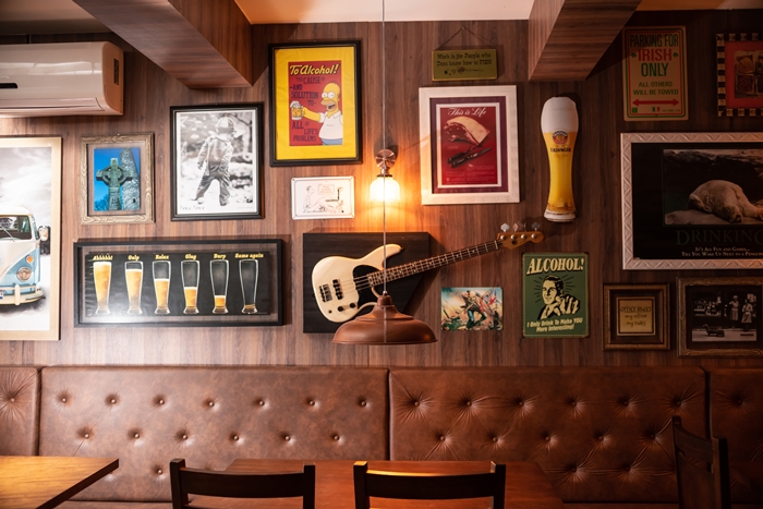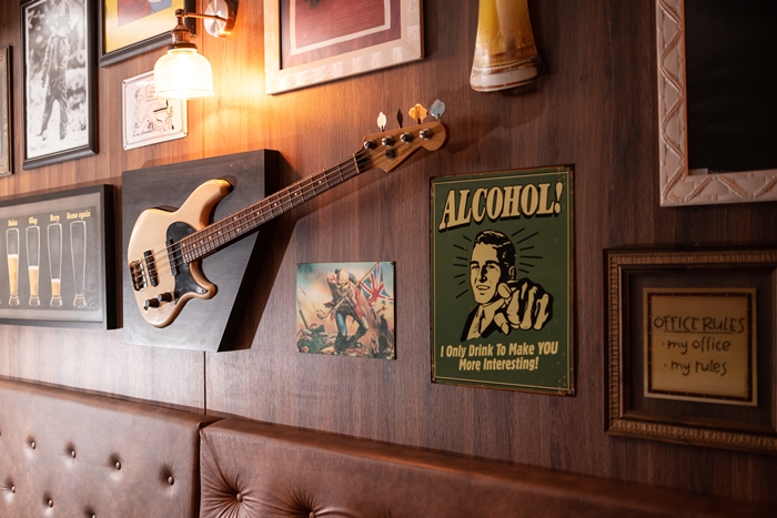A decoração do pub segue os elementos de um pub tradicional, com foco no rústico, o destaque fica para as peças em madeira e couro.