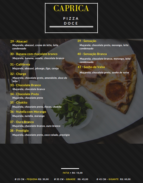 Com um cardápio variado, o Caprica tem mais de 40 sabores de pizzas salgadas e doces. Entre eles estão a mexicana, siciliana, calabresa, Nutella com morango e chocolate preto.