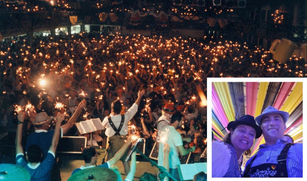 Neste ano, Vivian e Marlo celebram 28 anos de uma história que começou sob as lanternas da Schützenfest. O casal segue frequentando a festa todos os anos, revivendo o primeiro encontro com a mesma emoção. “Aquele encerramento da festa de 1997 foi mágico. Lembro das velas, das lanternas e da música ‘Linda Jaraguá’ tocando. Era um cenário de filme, e foi lá que a nossa história começou”, diz Vivian.