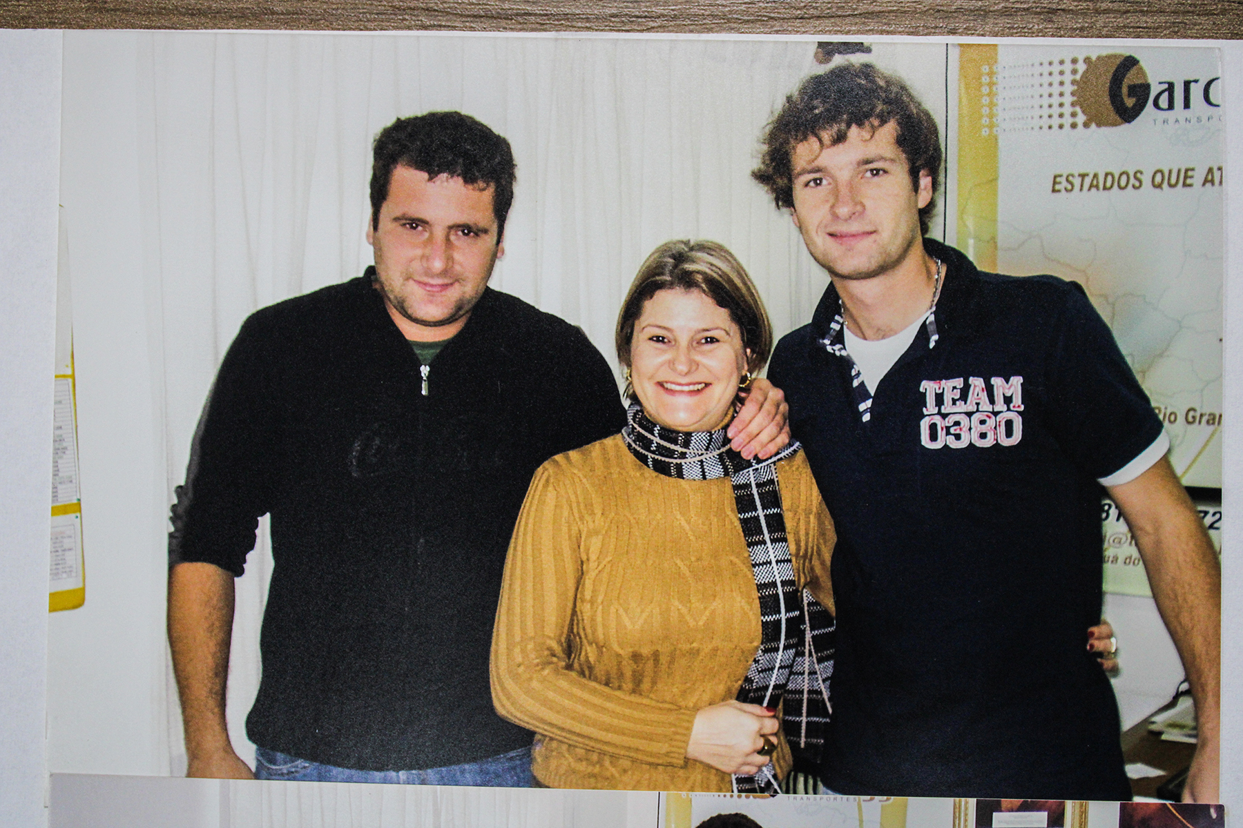 - Jonathan (E), Ediana e Jean Garcia, na antiga sede da Gartran | Fotografia do arquivo da família Garcia