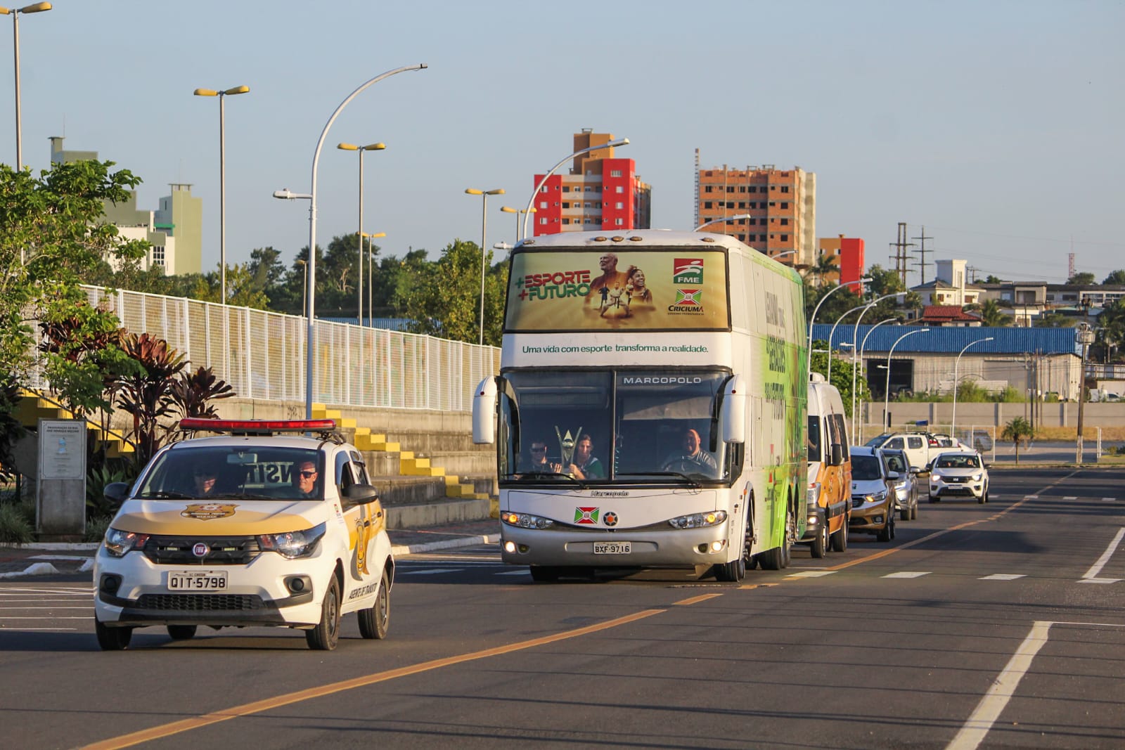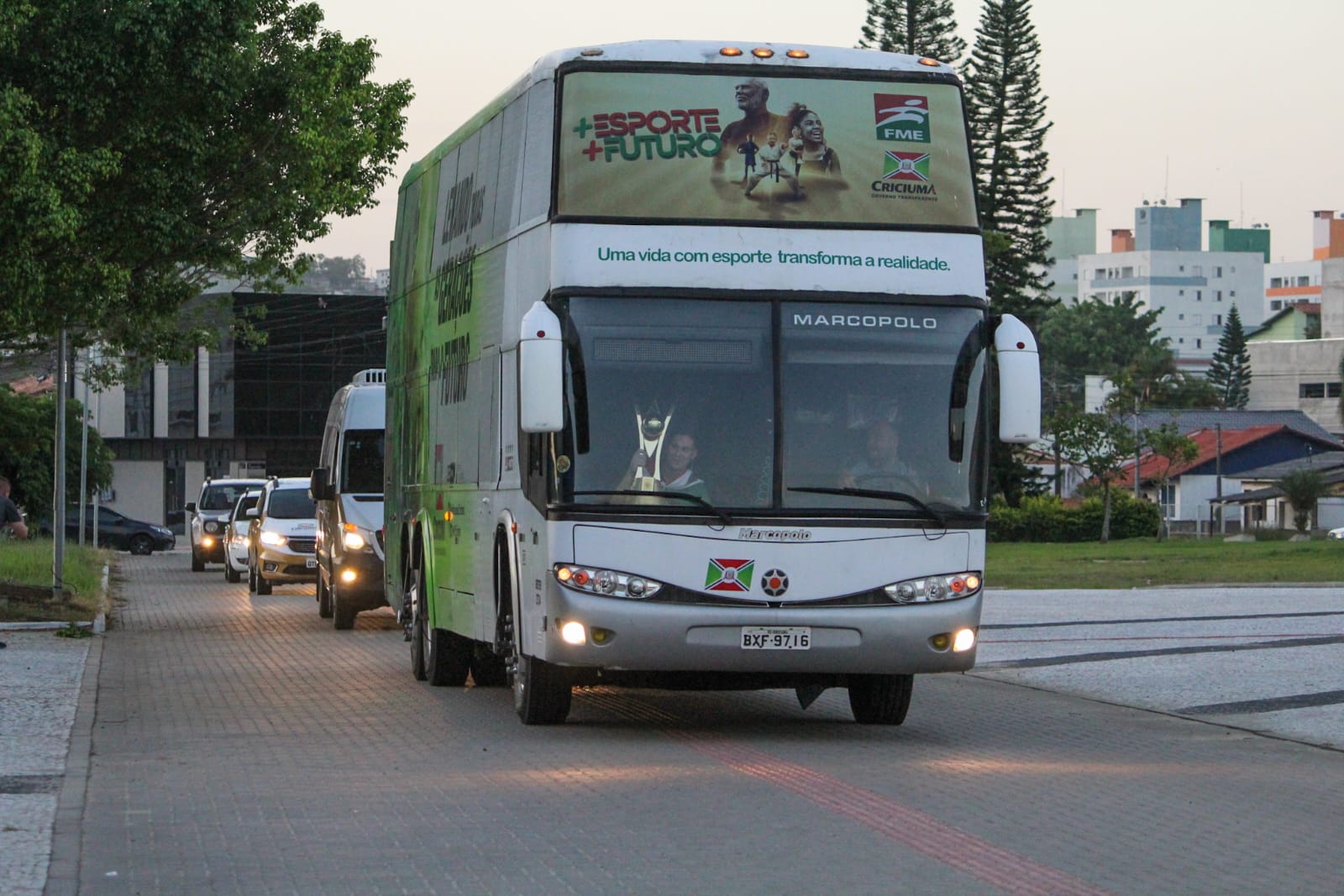 A delegação chegou na cidade por volta das 17h, foi recebida na Rua da Gente por colaboradores da FME e desfilou em carreata até a Fundação. Chegando no Ginásio Municipal, atletas e comissão técnica receberam o carinho de familiares e jogadores de outras categorias do futsal de Criciúma, que os aguardavam no local.