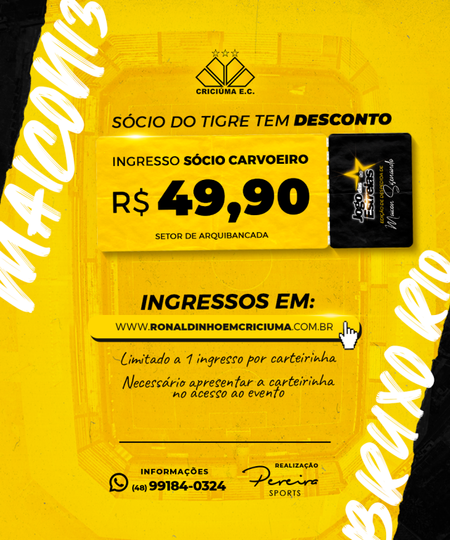 Conforme o organizador do evento e presidente da Pereira Sports, José Pereira, os ingressos continuam sendo vendidos nos mesmos locais. “O sócio-torcedor do Criciúma Esporte Clube tem desconto no ingresso pagando o valor de R$49,90 para arquibancada e R$120,00 para as cadeiras, neste primeiro lote. Lembrando que cada sócio poderá comprar apenas um ingresso e será necessário apresentar a carteirinha na hora da entrada. Os ingressos estão à venda na Ótica Ojo, localizada no Nações Shopping, e on-line no site https://www.ronaldinhoemcriciuma.com.br/ ”, destacou.